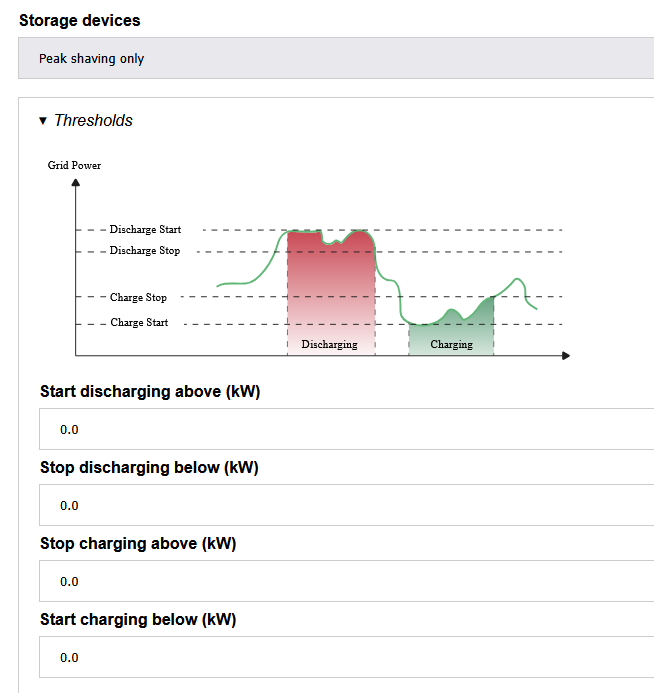 If the grid load falls below a lower threshold, the system starts charging the battery again until the load rises back above that level.